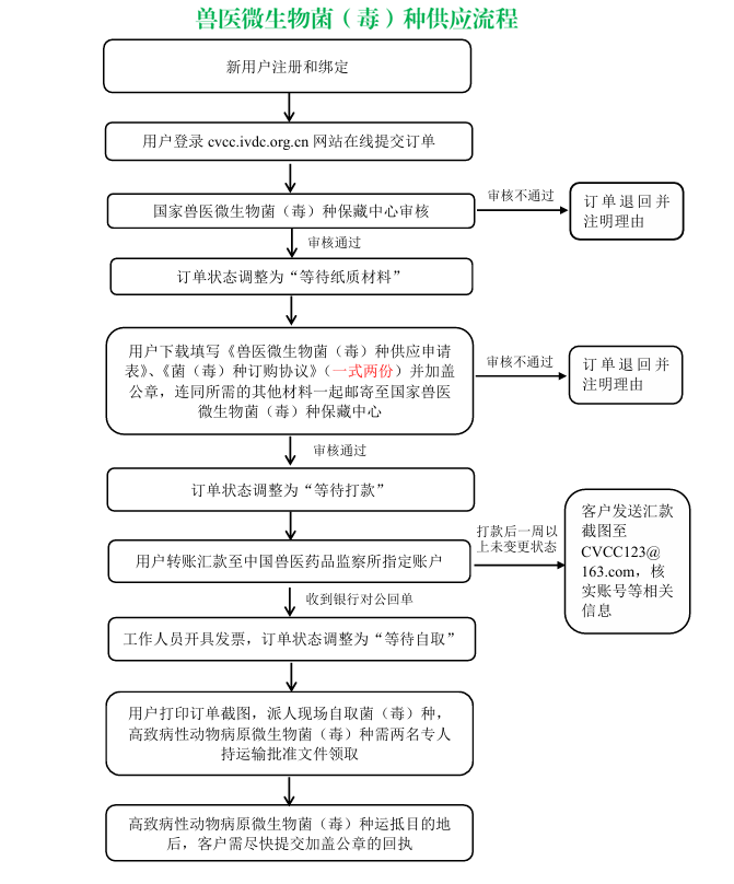 (四)申请表及资料审核。收到申请表等纸质材料后,对于一般菌(毒)种,中心于5个工作日内完成审核;对于生产、检验用菌(毒)种及高致病性菌(毒)种,中心于15个工作日内完成审核。审核通过的,中心在《协议》和《中国兽医药品监察所产品订购单》(以下简称《产品订购单》)上签章,订单状态变更为“审核通过”;审核未通过的,中心将通过电话方式通知客户。