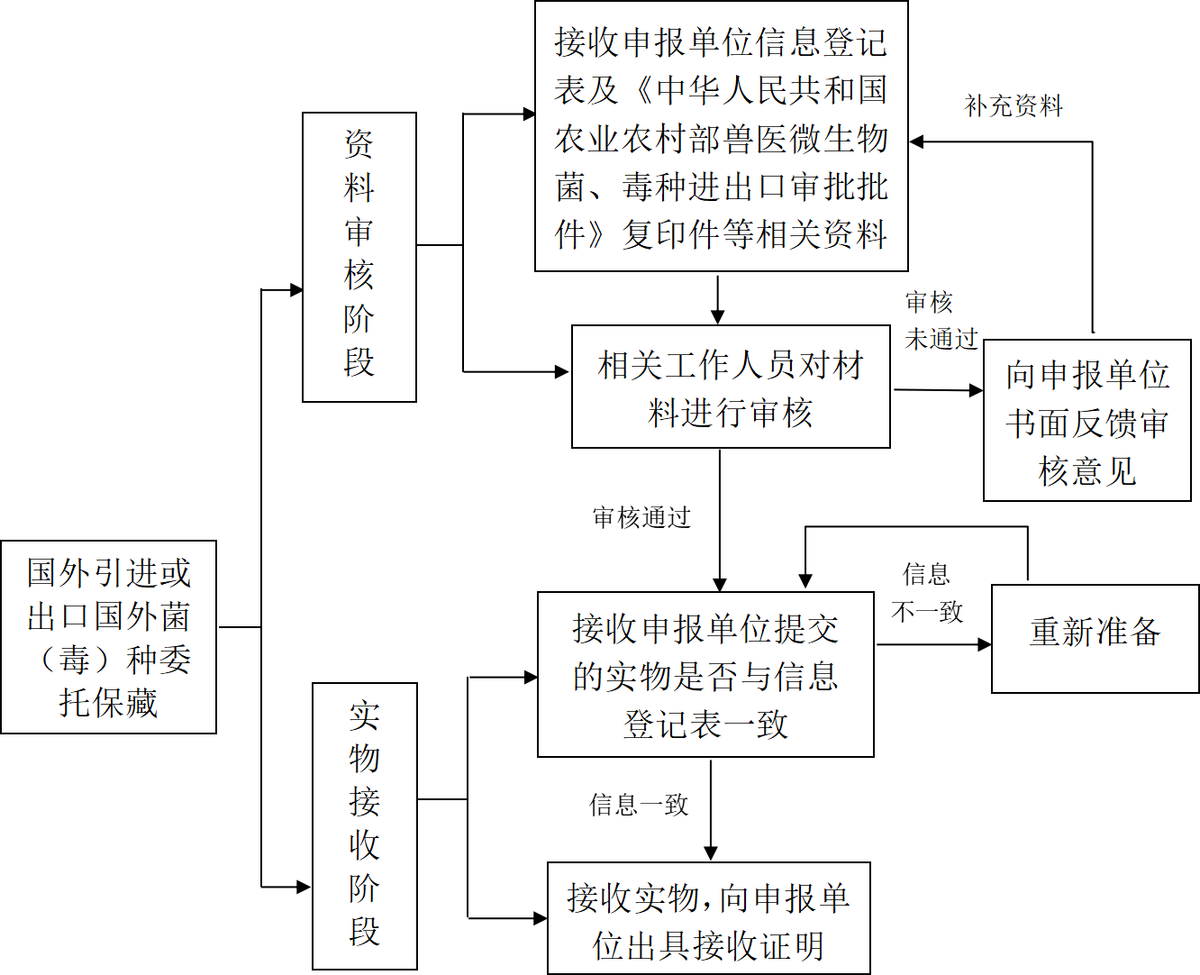 1. 接收申报单位提交的委托保藏菌(毒)种/细胞信息登记表及《中华人民共和国农业农村部兽医微生物菌、毒种进出口审批批件》复印件等相关纸质资料。