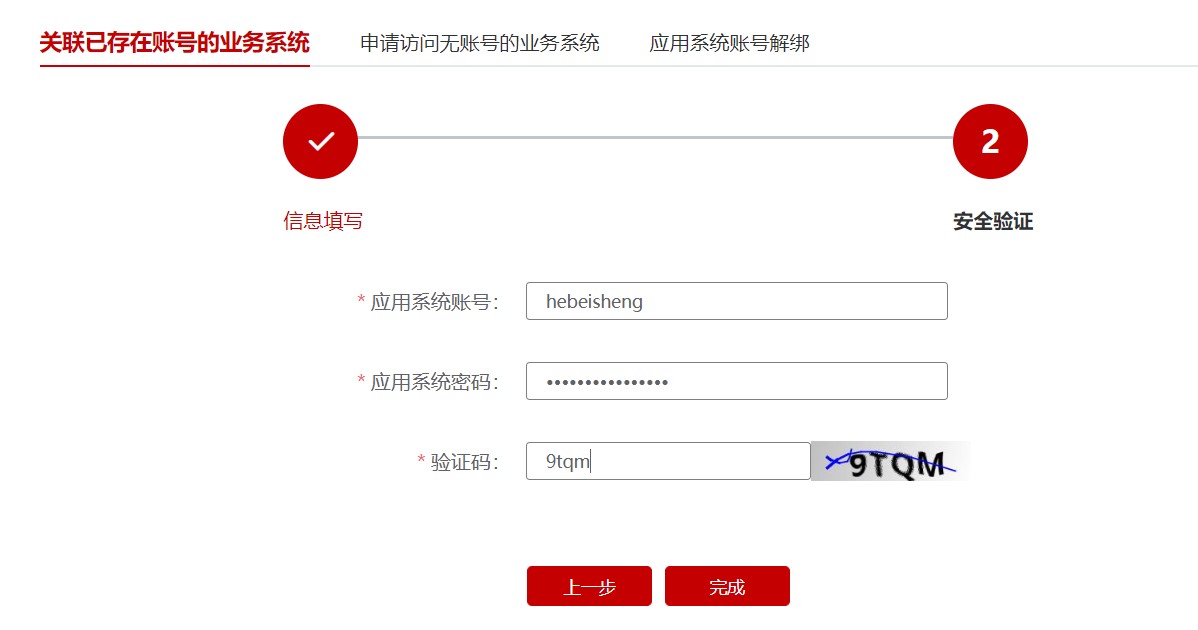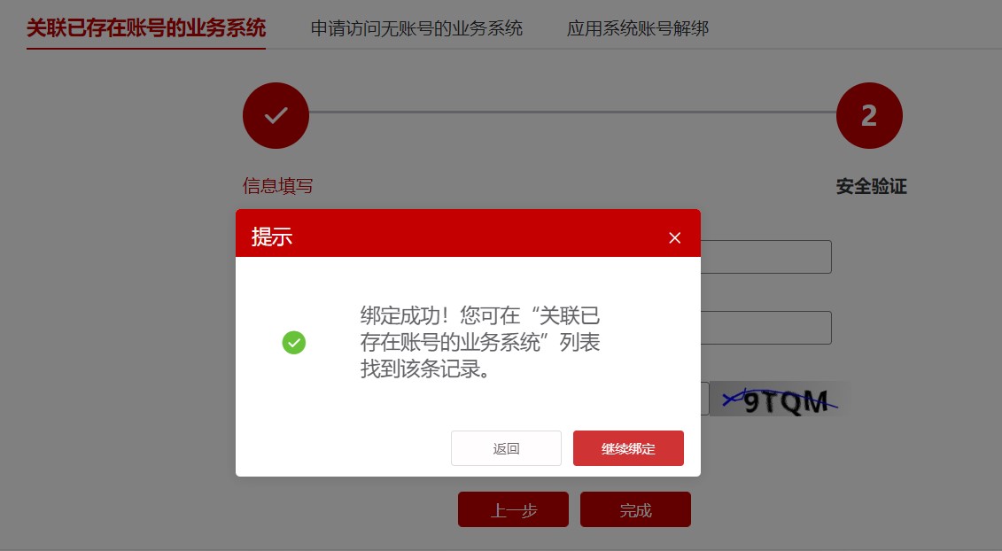 7. 填写应用系统密码(初始密码为默认密码)和验证码,点击完成。系统会弹出“绑定成功”。点击返回按钮。如下图。