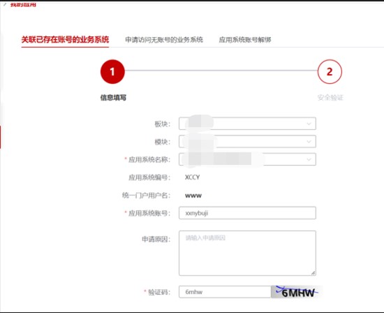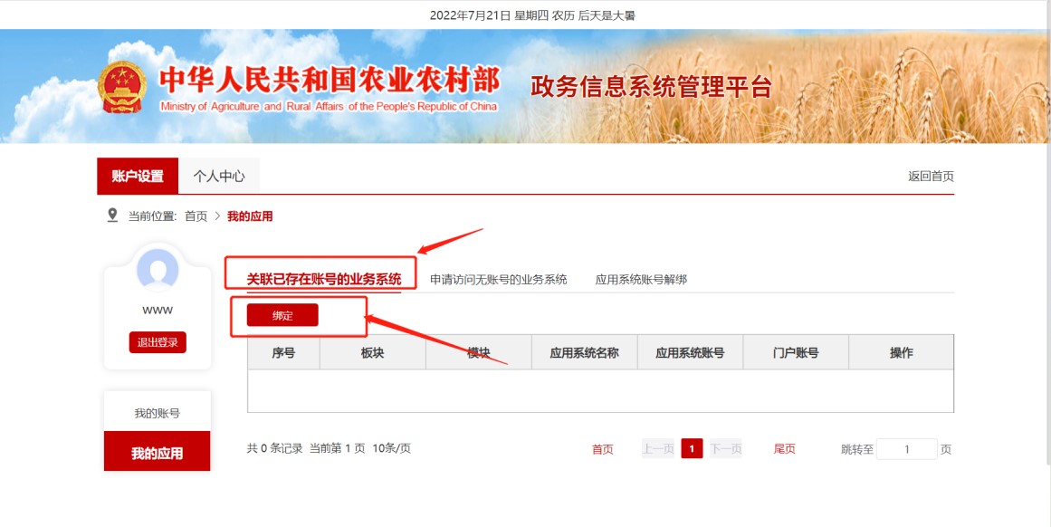 5. 进入账号设置页面,点击“关联已存在账号的业务系统”,点击”绑定“按钮,如下图。