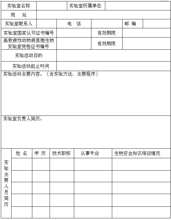(1)《高致病性动物病原微生物实验活动申请表》(一式2份)